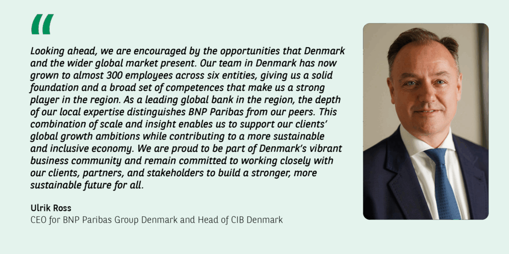 As a leading international banking player, BNP Paribas is committed to supporting the growth and development of the clients, and to contributing to the development of a more sustainable and equitable economy in Denmark and beyond.