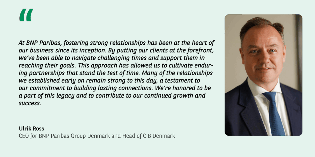 BNP Paribas’ presence in Denmark have roots that dates back to the 1980s, but its current branch was established in 2005. Today, BNP Paribas is a trusted partner for businesses in Denmark, building on its legacy of excellence and commitment to customer satisfaction, with a strong team and a growing presence in the region.